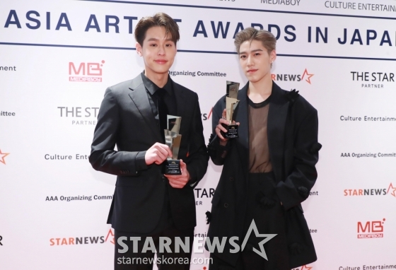 태국 아티스트 빌킨, 피피끄릿이 13일 오후 일본 나고야 니혼가이시홀에서 열린 스타뉴스-미디어보이 주최 '2022 Asia Artist Awards IN JAPAN'(2022 아시아 아티스트 어워즈, 이하 2022 AAA)에서 AAA 아시아 셀러브리티상을 수상한 뒤 포즈를 취하고 있다.