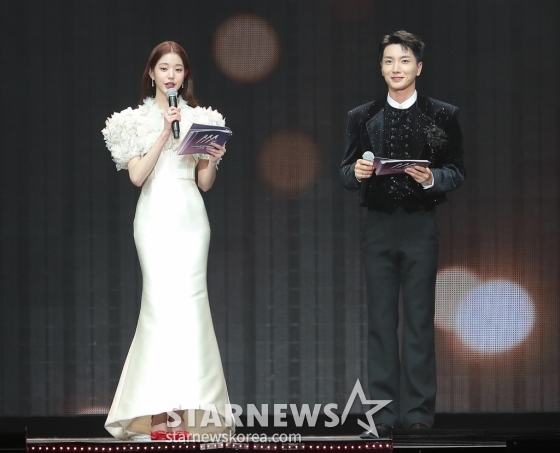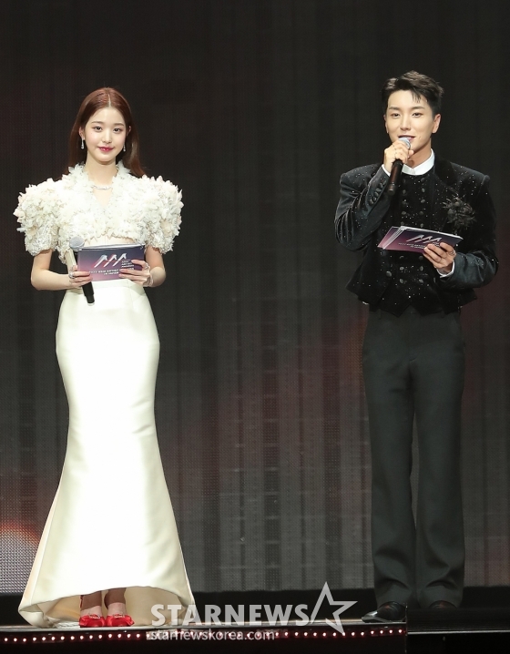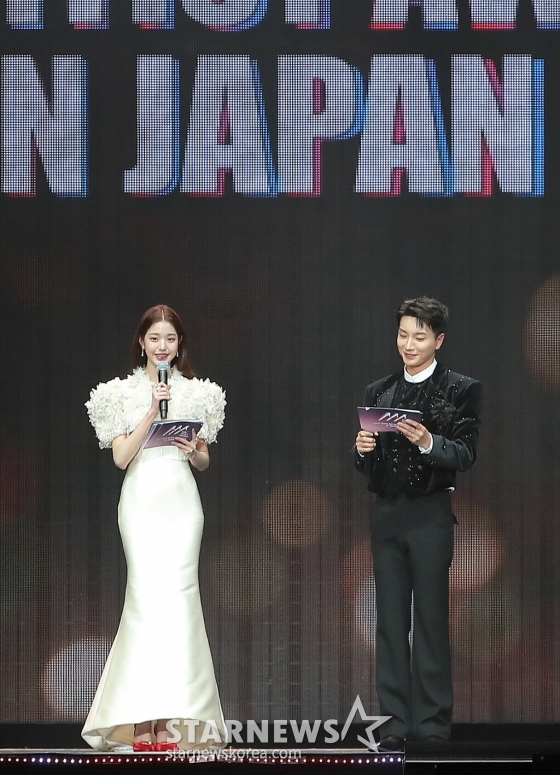 아이브 장원영, 슈퍼주니어 이특이 지난 13일 오후 일본 나고야 니혼가이시홀에서 열린 스타뉴스-미디어보이 주최 '2022 Asia Artist Awards IN JAPAN'(2022 아시아 아티스트 어워즈, 이하 2022 AAA)에서 MC를 맡아 진행하고 있다.