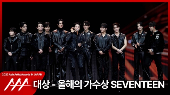 그룹 세븐틴 (SEVENTEEN)이 13일 오후 일본 나고야 니혼가이시홀에서 열린 스타뉴스-미디어보이 주최 '2022 Asia Artist Awards IN JAPAN'(2022 아시아 아티스트 어워즈)에서 대상 - 올해의 가수상을 받아 수상소감을 하고 있다.