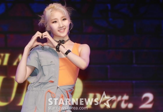 걸그룹 라필루스(Lapillus) 샤나가 21일 오후 서울 강서구 램넌트문화센터 스카이아트홀에서 진행된 두 번째 미니앨범 '걸스 라운드 파트 2'(GIRL’s ROUND Part. 2) 발매기념 쇼케이서에서 포즈를 취하고 있다.