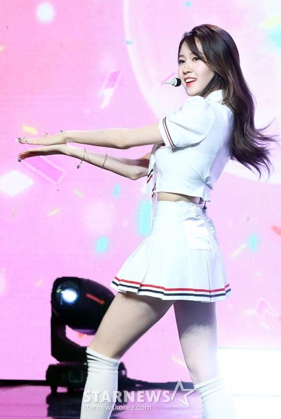 걸그룹 아일리원(ILY:1) 아라가 25일 오후 서울 강남구 청담동 일지아트홀에서 진행된 두 번째 미니 앨범 'New Chapter(뉴 챕터)' 발매 기념 쇼케이스에 참석해 멋진 무대를 선보이고 있다.