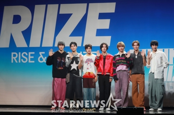 SM엔터테인먼트 신인 그룹 라이즈(RIIZE)가 4일 오후 서울 용산구 블루스퀘어에서 진행된 첫 싱글 '겟 어 기타'(Get A Guitar) 발매 기념 쇼케이스에서 포즈를 취하고 있다.