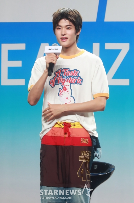 SM엔터테인먼트 신인 그룹 라이즈(RIIZE) 소희가 4일 오후 서울 용산구 블루스퀘어에서 진행된 첫 싱글 '겟 어 기타'(Get A Guitar) 발매 기념 쇼케이스에서 인사말을 하고 있다.