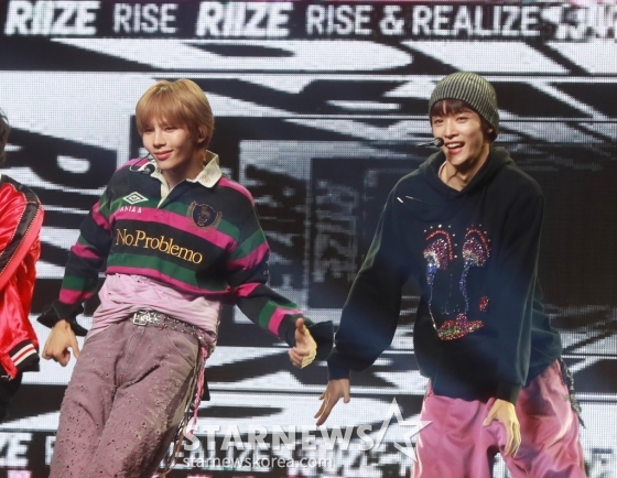 SM엔터테인먼트 신인 그룹 라이즈(RIIZE) 쇼타로, 성찬이 4일 오후 서울 용산구 블루스퀘어에서 진행된 첫 싱글 '겟 어 기타'(Get A Guitar) 발매 기념 쇼케이스에서 신곡을 선보이고 있다.