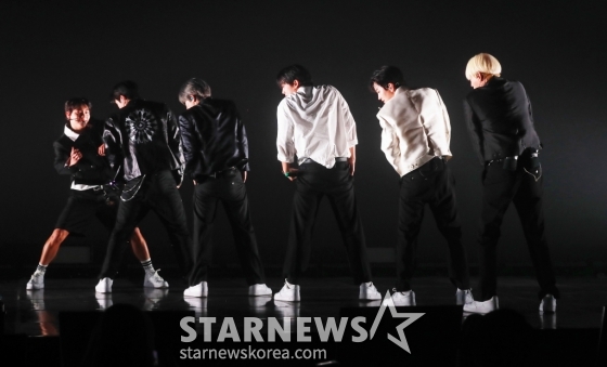 그룹 온앤오프(ONF)가 4일 오후 서울 마포구 신한PLAY 스퀘어에서 진행된 일곱 번째 미니 앨범 '러브 이펙트'(LOVE EFFECT) 발매기념 쇼케이스에서 신곡을 선보이고 있다.