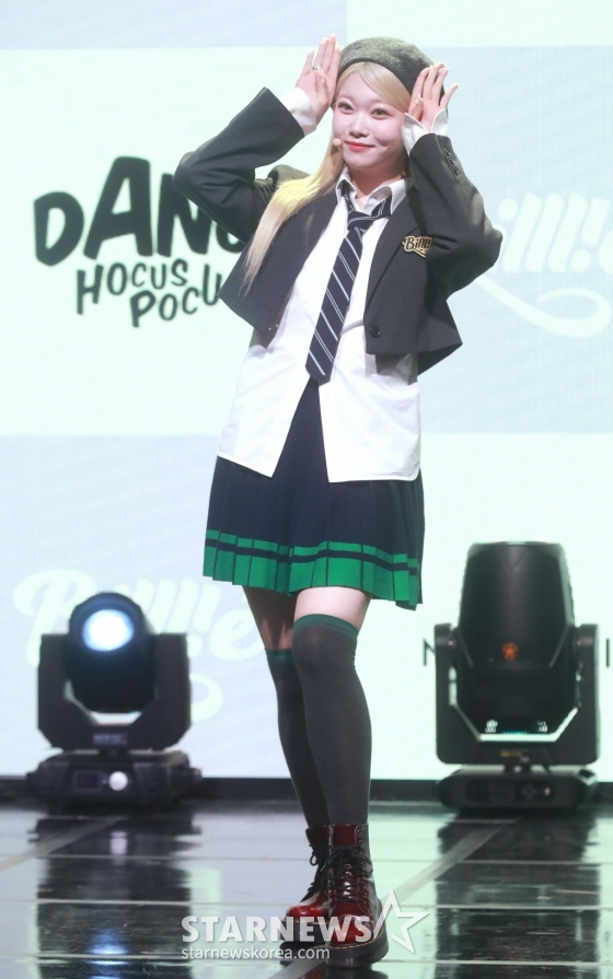 걸그룹 빌리(Billlie) 츠키가 23일 오후 서울 마포구 신한PLAY스퀘어에서 진행된 싱글 1집 '사이드-비 : 메모얼스 오브 에코 언씬'(side-B : memoirs of echo unseen) 발매기념 쇼케이스에서 포즈를 취하고 있다.