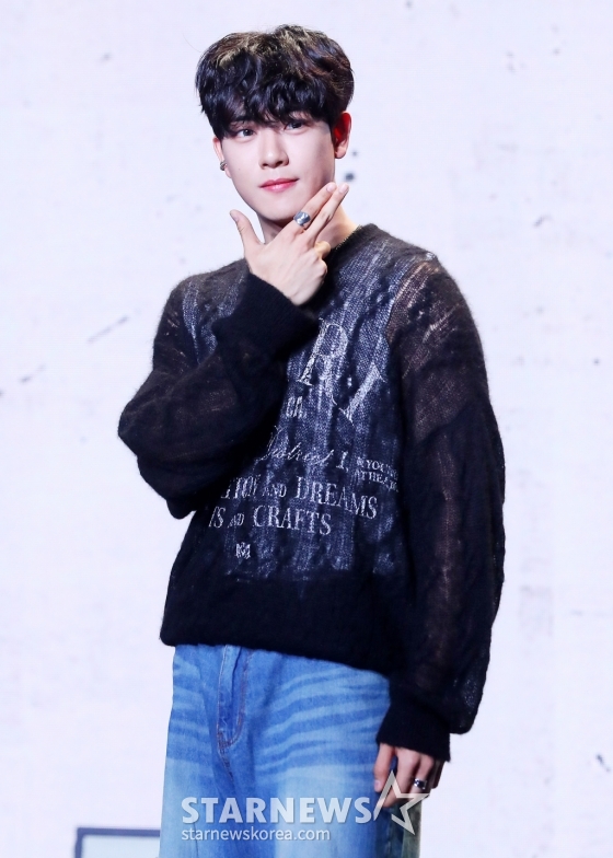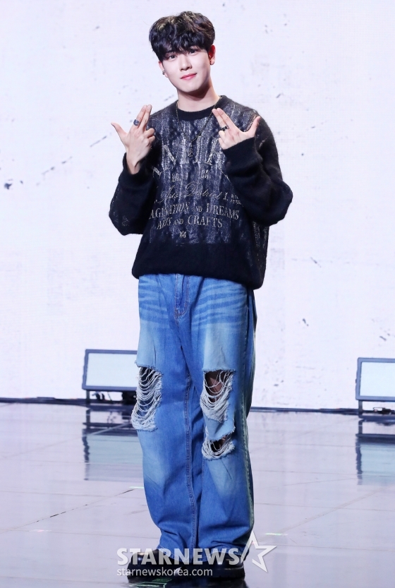 그룹 골든차일드(Golden Child) 김지범이 2일 오후 서울 강남구 청담동 일지아트홀에서 진행된 세 번째 싱글 '필 미(Feel me)' 발매 기념 쇼케이스에 참석해 포즈를 취하고 있다.