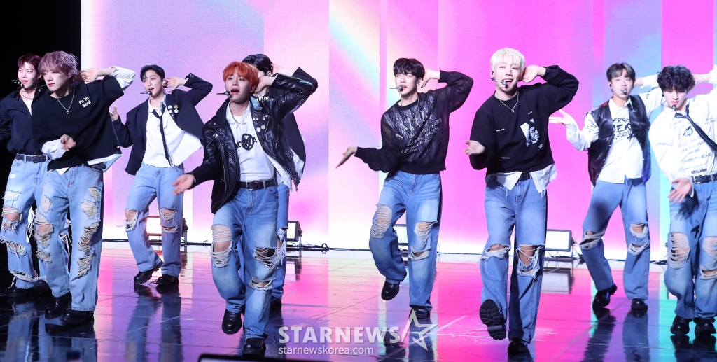 그룹 골든차일드(Golden Child)가 2일 오후 서울 강남구 청담동 일지아트홀에서 진행된 세 번째 싱글 '필 미(Feel me)' 발매 기념 쇼케이스에 참석해 멋진 무대를 선보이고 있다.