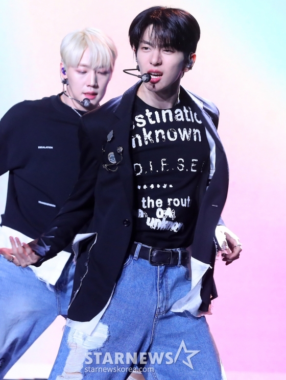 그룹 골든차일드(Golden Child) 최보민이 2일 오후 서울 강남구 청담동 일지아트홀에서 진행된 세 번째 싱글 '필 미(Feel me)' 발매 기념 쇼케이스에 참석해 멋진 무대를 선보이고 있다.