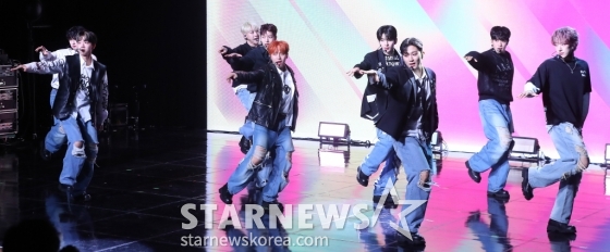 그룹 골든차일드(Golden Child)가 2일 오후 서울 강남구 청담동 일지아트홀에서 진행된 세 번째 싱글 '필 미(Feel me)' 발매 기념 쇼케이스에 참석해 멋진 무대를 선보이고 있다.