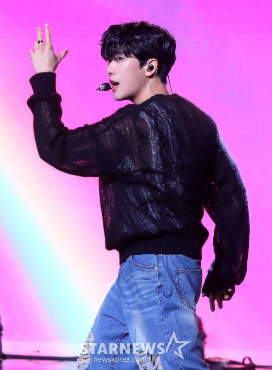 그룹 골든차일드(Golden Child) 지범이 2일 오후 서울 강남구 청담동 일지아트홀에서 진행된 세 번째 싱글 '필 미(Feel me)' 발매 기념 쇼케이스에 참석해 멋진 무대를 선보이고 있다.