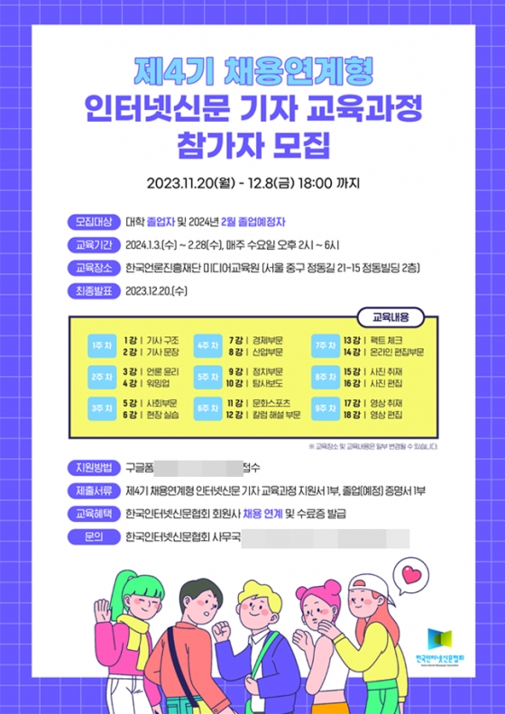 한국인터넷신문협회는 "우수한 언론인 육성을 위해 연 2회 채용연계형 기자교육을 실시하고 있으며, 3기까지 총 84명의 수료생을 배출했다"고 전했다. 제4기 교육은 내년 1월 3일부터 9주간 진행되며 교육비는 전액 한국인터넷신문협회에서 지원한다.