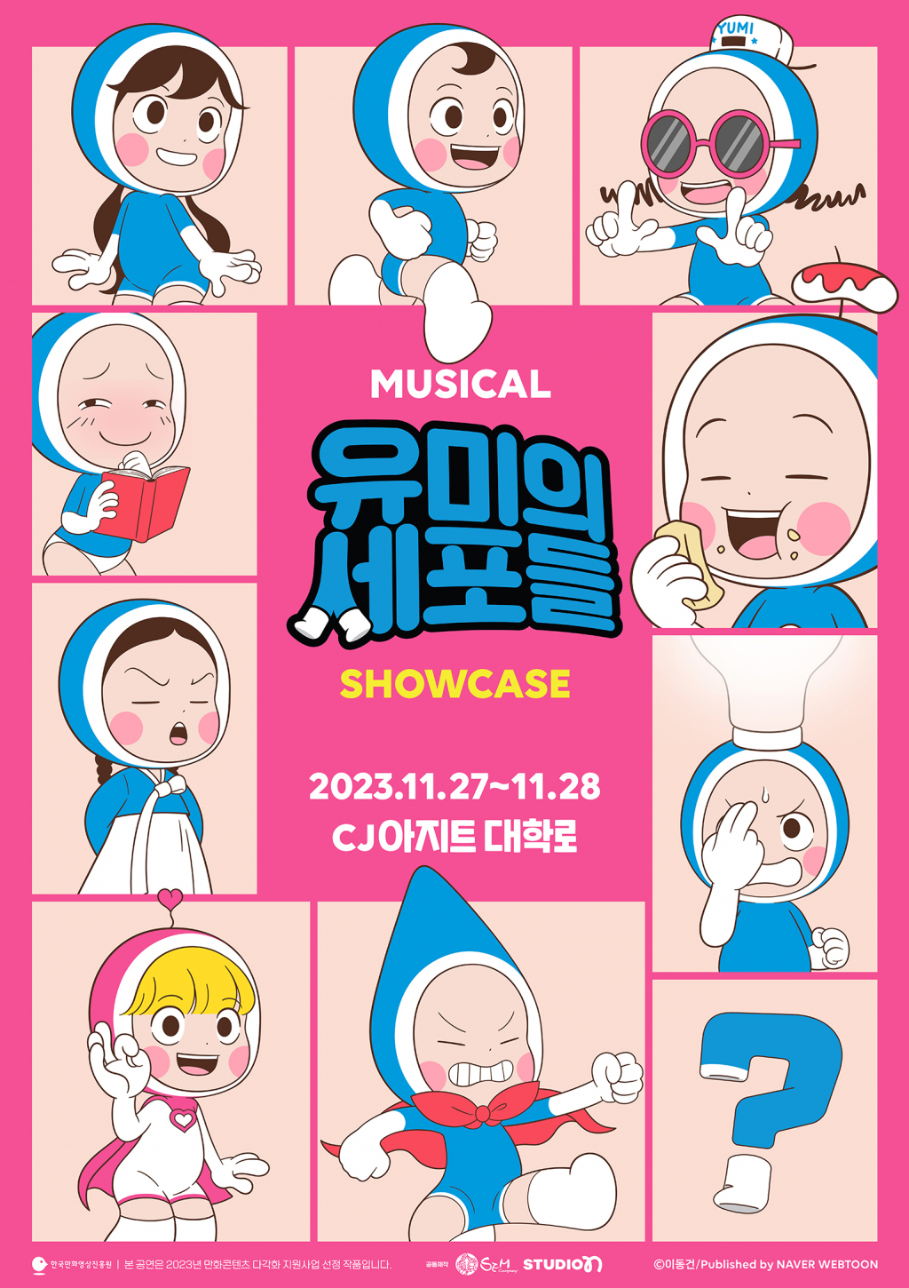 '유미의 세포들'의 뜨거운 사랑에 힘입어 네이버웹툰 자회사인 스튜디오N과 샘컴퍼니가 만나 뮤지컬 제작을 본격화하고 있다. 2023 만화콘텐츠 다각화 지원사업에 선정된 '유미의 세포들' 뮤지컬은 '유미'의 서사보다 '세포'들의 이야기에 중점을 두어 새로운 시선과 신선한 전개를 느낄 수 있어 더욱 기대감을 모은다. 공개된 쇼케이스 포스터는 핑크색의 강렬한 컬러감에 대비된 세포들이 한껏 돋보인다. 또한, 다양한 유미의 세포들 사이 물음표 모양은 새로운 등장인물과 세포들의 시선으로 바라본 스토리에 대한 기대감을 더욱 끌어 올리고 있다.