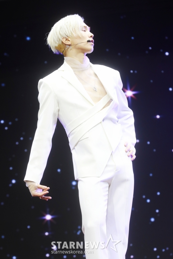 가수 라키(ROCKY)가 22일 오후 서울 강서구 스카이아트홀에서 진행된 미니 1집 '라키스트'(ROCKYST) 발매기념 쇼케이스에서 신곡을 선보이고 있다.