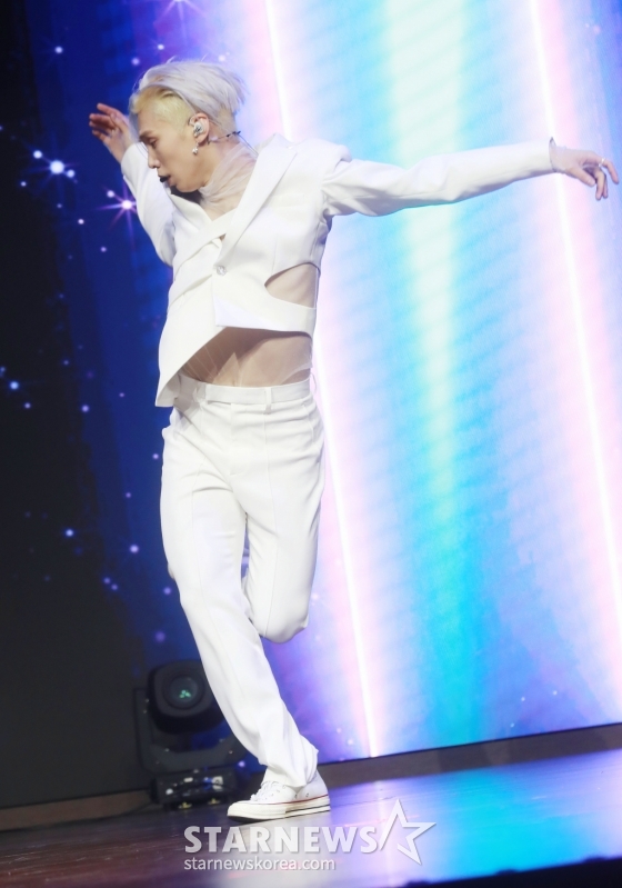 가수 라키(ROCKY)가 22일 오후 서울 강서구 스카이아트홀에서 진행된 미니 1집 '라키스트'(ROCKYST) 발매기념 쇼케이스에서 신곡을 선보이고 있다.