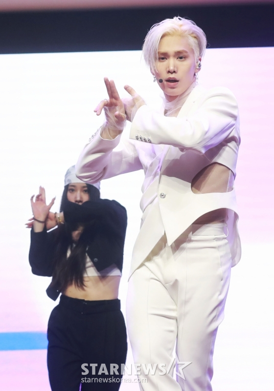 가수 라키(ROCKY)가 22일 오후 서울 강서구 스카이아트홀에서 진행된 미니 1집 '라키스트'(ROCKYST) 발매기념 쇼케이스에서 신곡을 선보이고 있다.