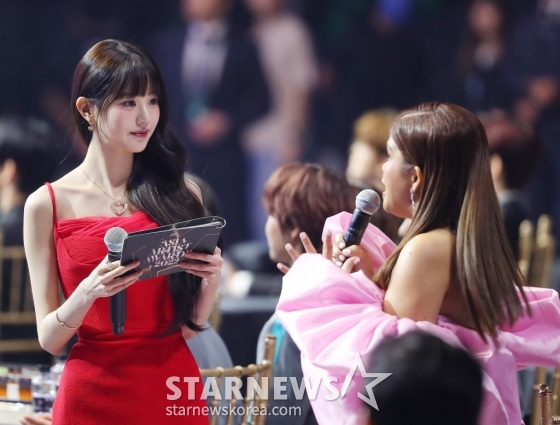 MC 아이브 장원영이 14일 필리핀 아레나에서 열린 '2023 아시아 아티스트 어워즈 인 필리핀'(2023 Asia Artist Awards IN THE PHILIPPINES, 이하 '2023 AAA')에서 필리핀 배우 멜라이 칸티베로스 프란시스코와 인터뷰를 하고 있다.