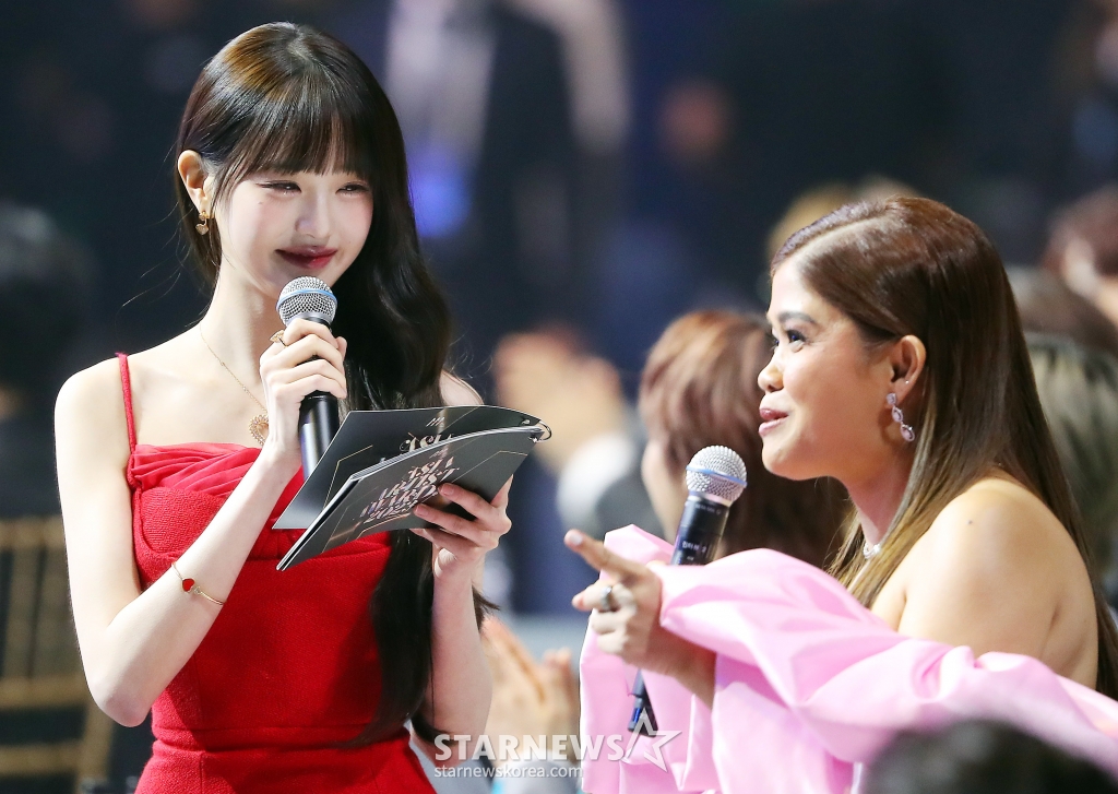 MC 아이브 장원영이 14일 필리핀 아레나에서 열린 '2023 아시아 아티스트 어워즈 인 필리핀'(2023 Asia Artist Awards IN THE PHILIPPINES, 이하 '2023 AAA')에서 필리핀 배우 멜라이 칸티베로스 프란시스코와 인터뷰를 하고 있다.