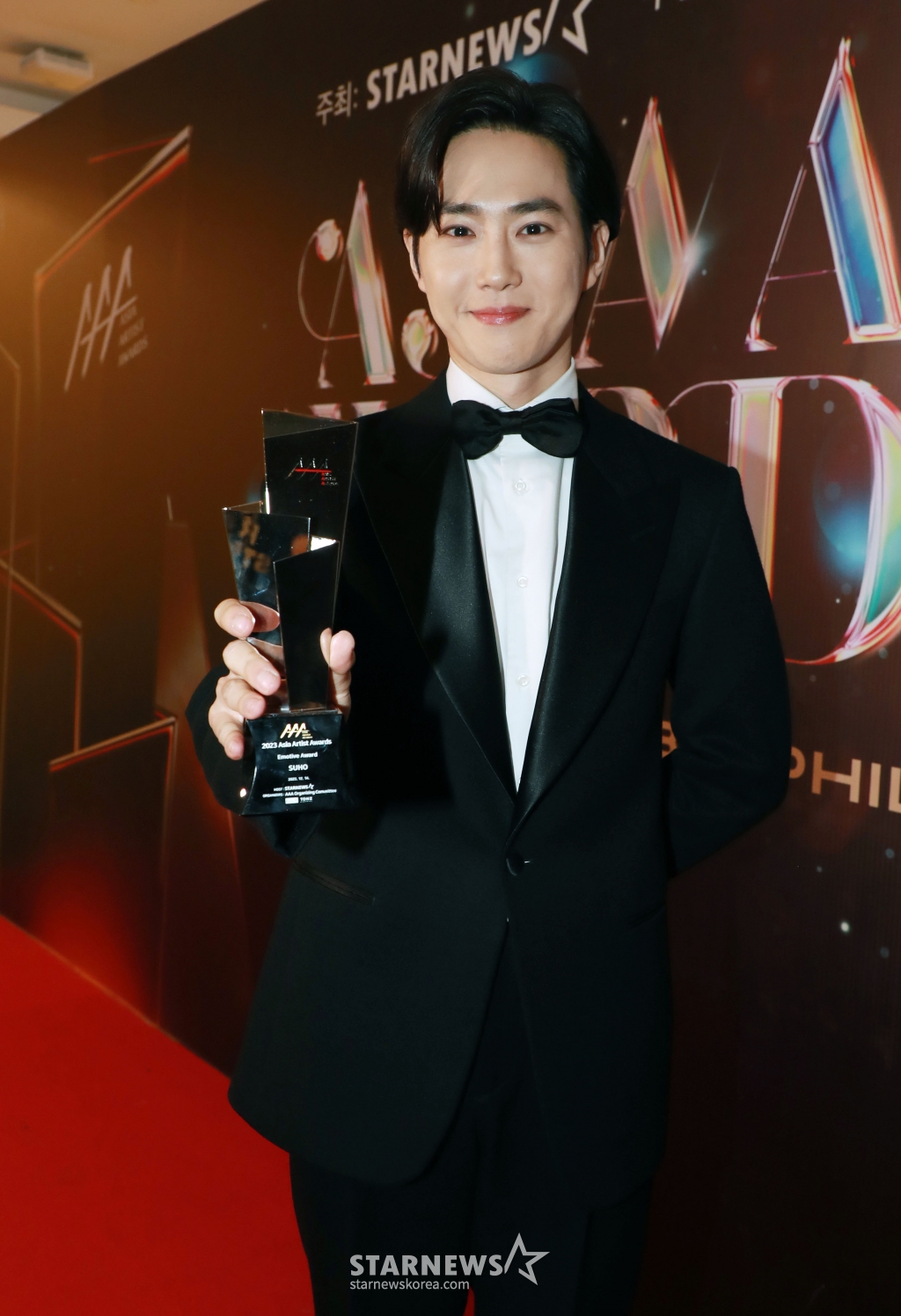 배우 수호가 14일 필리핀 아레나에서 열린 '2023 아시아 아티스트 어워즈 인 필리핀'(2023 Asia Artist Awards IN THE PHILIPPINES, 이하 '2023 AAA')에서 AAA 이모티브 상을 수상한 뒤 포즈를 취하고 있다.