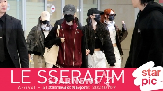 그룹 르세라핌(LE SSERAFIM) 허윤진, 카즈하, 사쿠라, 홍은채, 김채원이 '제38회 골든디스크 어워즈' 일정을 마치고 7일 오전 인천국제공항을 통해 입국하고 있다. 2024.01.07