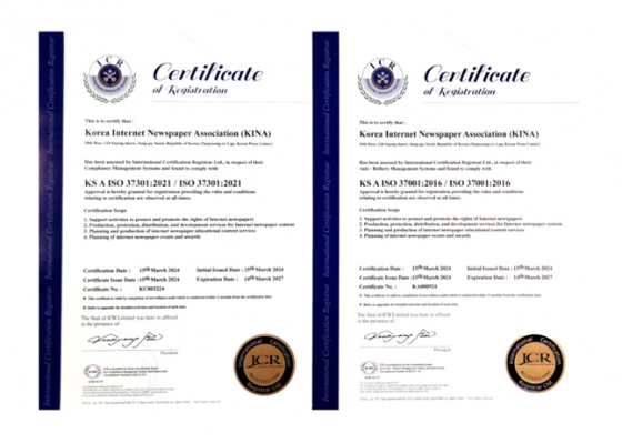 한국인터넷신문협회는 "규범준수경영과 부패방지경영 국제표준 인증을 동시에 취득함에 따라 글로벌 표준에 부합하는 투명성과 준법성을 확보하게 됐다"고 설명했다.