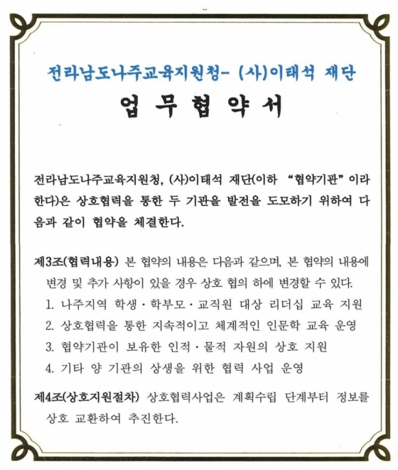 협약내용은 재단이 나주지역 초중고와 학부모, 교직원을 대상으로 리더십과 인문학 교육을 지원하는 것이다.