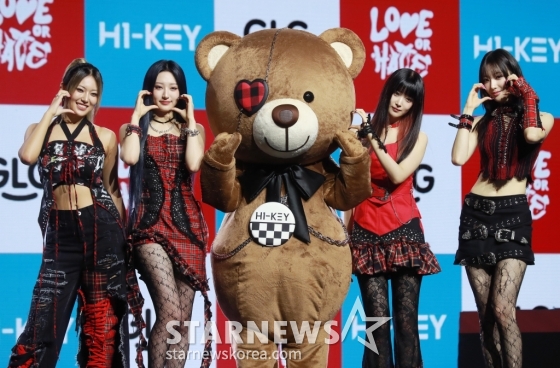 걸그룹 하이키가 19일 오후 서울 용산구 블루스퀘어에서 진행된 미니 3집 '러브 오어 헤이트' 발매기념 쇼케이스에서 마스코트 베니크와 포즈를 취하고 있다.
