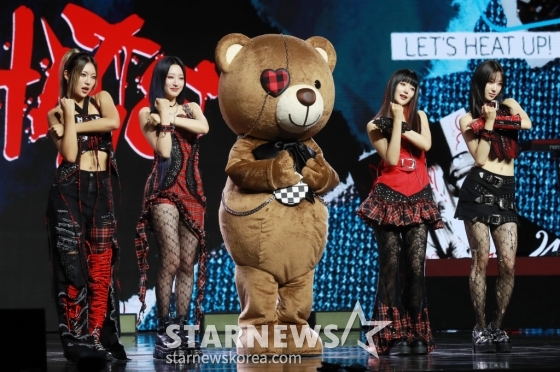 걸그룹 하이키가 19일 오후 서울 용산구 블루스퀘어에서 진행된 미니 3집 '러브 오어 헤이트' 발매기념 쇼케이스에서 마스코트 베니크와 포즈를 취하고 있다.