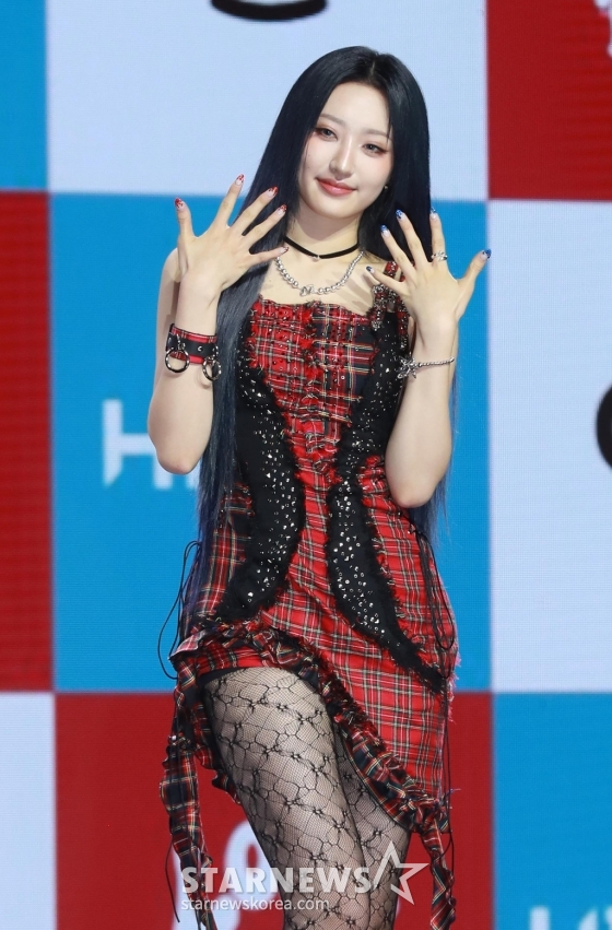 걸그룹 하이키 휘서가 19일 오후 서울 용산구 블루스퀘어에서 진행된 미니 3집 '러브 오어 헤이트' 발매기념 쇼케이스에서 마스코트 베니크와 포즈를 취하고 있다.