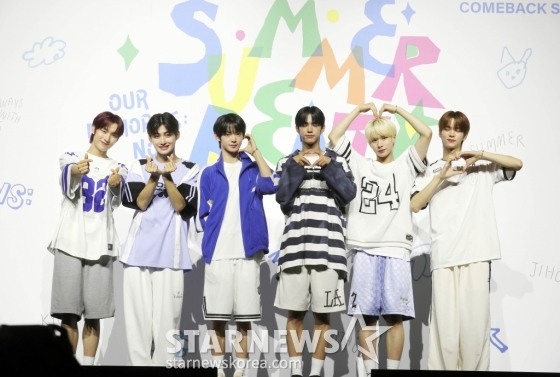 그룹 투어스(TWS) 영재, 지훈, 한진, 도훈, 경민, 신유가 24일 오후 서울 용산구 블루스퀘어 마스터카드홀에서 미니 2집 'SUMMER BEAT!'를 발매기념 쇼케이스를 열고 포즈를 취하고 있다. 2024.06.24