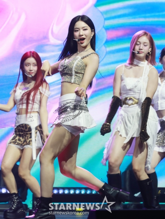 걸그룹 스테이씨가 1일 오후 서울 광진구 예스24라이브홀에서 진행된 정규 1집 '메타모르픽'(Metamorphic) 발매기념 쇼케이스에서 신곡을 선보이고 있다.