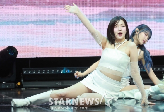 걸그룹 위클리(Weeekly)가 9일 서울 마포구 서교동 메세나폴리스 신한카드 SOL 페이 스퀘어 라이브홀에서 진행된 미니 6집 '블리스(Bliss)' 쇼케이스에서 신곡을 선보이고 있다.