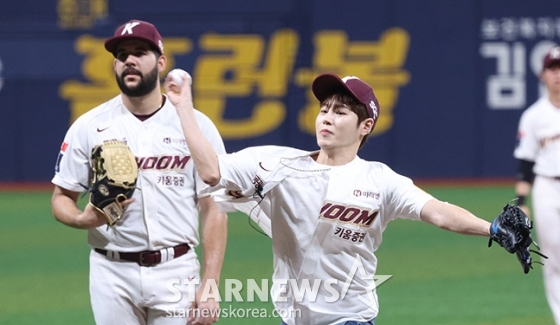 가수 하성운이 키움 선발 헤이수스 앞에서 히어로즈 승리기원 시구를 하고 있다.
