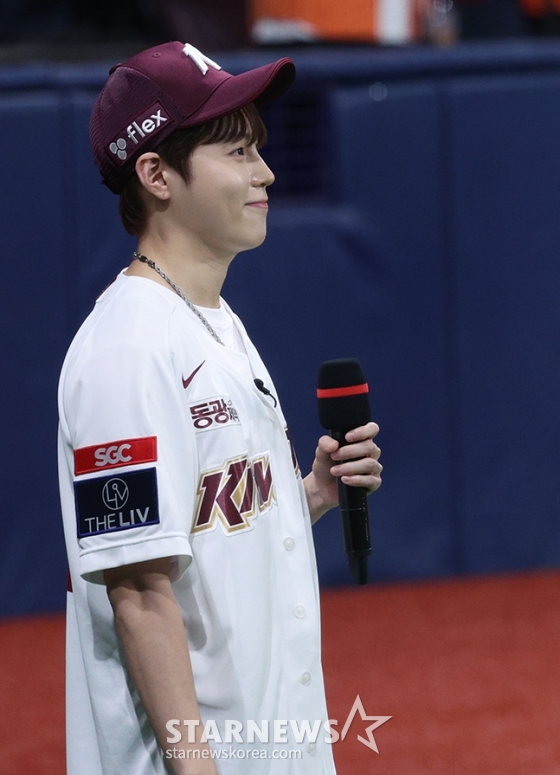 가수 하성운이 히어로즈 승리기원 시구를 하기 전애 애국가를 부르고 있다.
