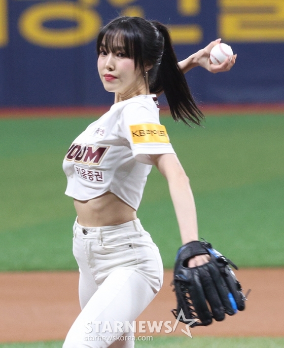 가수 유주가 히어로즈 승리기원 시구를 하고 있다.