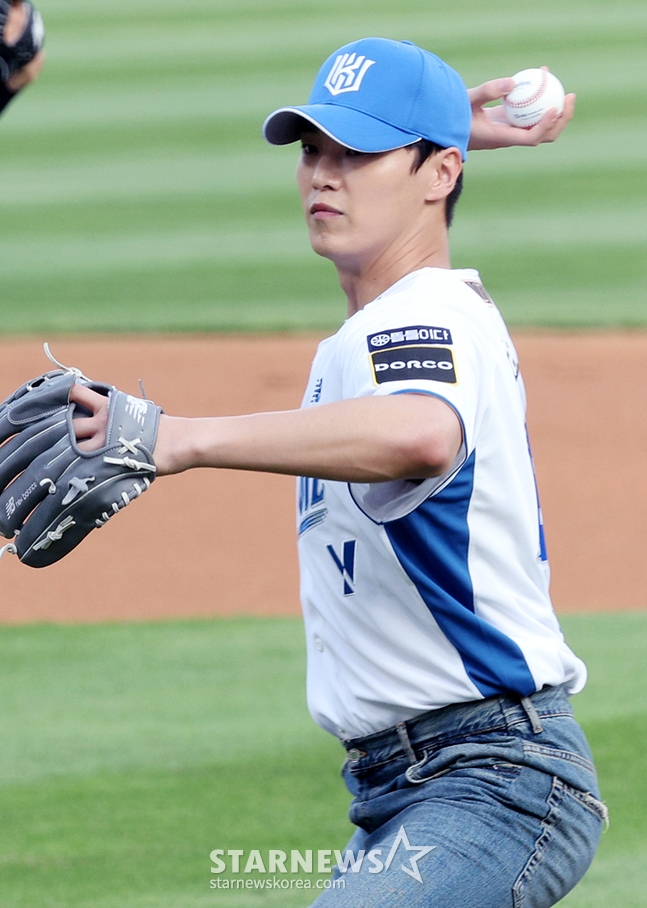 'Y 워터 페스티벌'로 진행된 이날, 배우 이태환이 kt 승리기원 시구를 하고 있다.