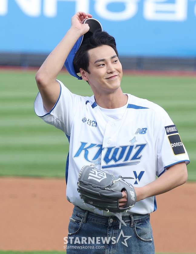 'Y 워터 페스티벌'로 진행된 이날, 배우 이태환이 kt 승리기원 시구를 하고 있다.