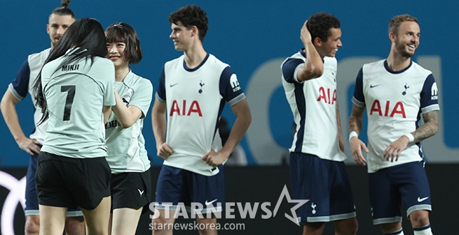 걸그룹 뉴진스(NewJeans-민지 하니 다니엘 해린 혜인) 멤버 민지의 시축이 빗나가자 토트넘 선수들이 웃음을 터뜨리고 있다.