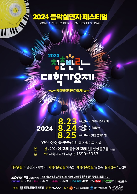 이일섭 STN 방송사 부회장이 제작총괄을 맡고, 한국음악실연자연합회가 주최, STN방송사가 주관하는 '2024 청춘 반란 대학가요제'는 오는 8월 23일부터 25일까지 인천 제 8부두의 상상 플랫폼에서 개최될 예정이다.