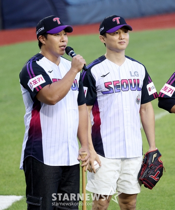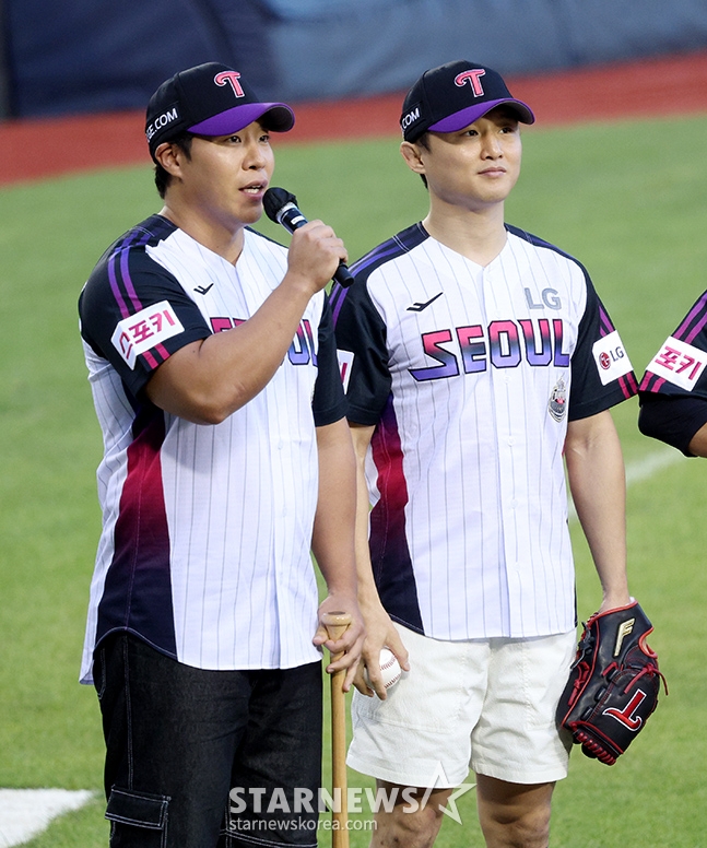 경기에 앞서 UFC 선수 최두호가 LG 승리기원 시구를 배우 태원석이 시타를 맡았다. 태원석이 인사말을 하고 있다.