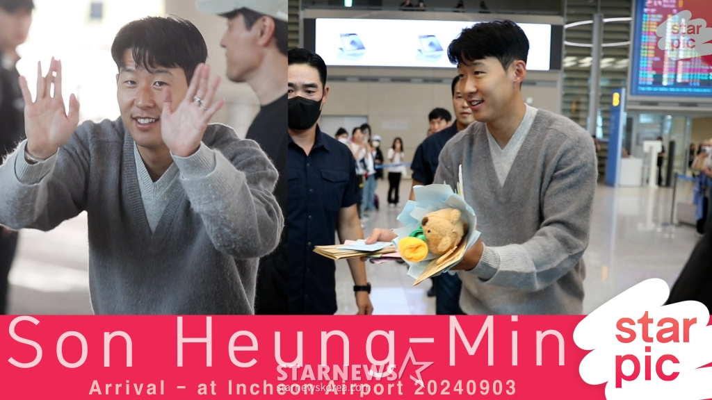 토트넘 홋스퍼 손흥민이 오는 5일 서울 상암월드컵경기장에서 열리는 팔레스타인과 2026 국제축구연맹(FIFA) 북중미 월드컵 3차 예선 1차전을 위해 3일 오후 인천국제공항을 통해 입국하고 있다. 2024.09.03