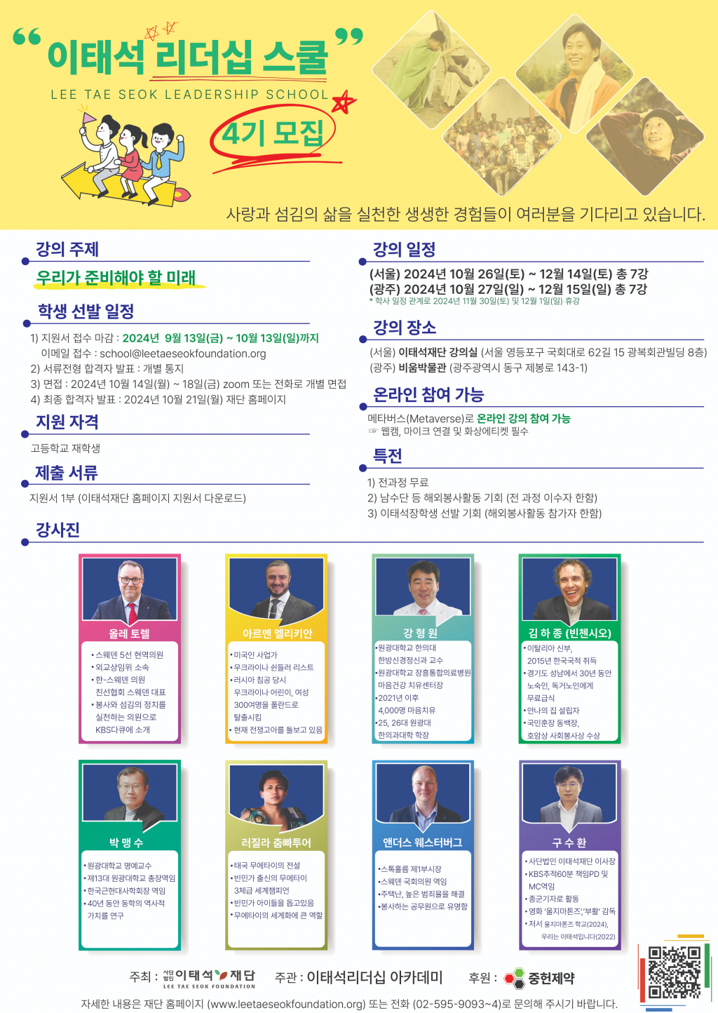 이태석 리더십스쿨 4기 신청은 전국 고등학교에 재학 중이면 가능하다. 지원서 접수는 2024년 9월 13일부터 10월 13일까지 한 달 간 진행되며, 지원서류는 이태석재단 홈페이지에서 확인할 수 있고 수업료는 무료다.