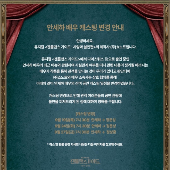 쇼노트는 "''젠틀맨스 가이드'에서 다이스퀴스 역으로 출연 중인 안세하 배우의 최근 이슈와 관련해 사실관계 여부를 떠나 관련 내용이 정리될 때까지는 배우가 작품을 통해 관객을 만나는 것이 무리가 있다고 판단돼 쇼노트와 배우 소속사는 상호 협의를 통해 아래와 같이 안세하 배우의 잔여 공연 캐스팅 일정을 변경했다"라고 설명했다.