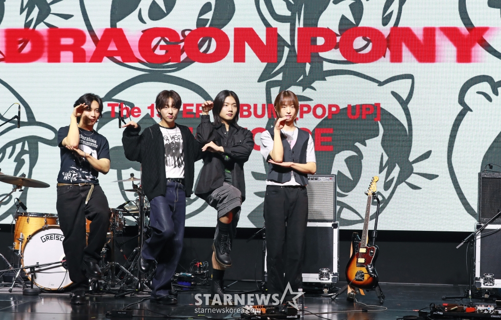 '안테나 첫 보이밴드' 드래곤포니(Dragon Pony)가 26일 오후 서울 예스24 원더로크홀에서 진행된 데뷔 EP ‘POP UP'(팝업) 발매 기념 쇼케이스에서 포즈를 취하고 있다.