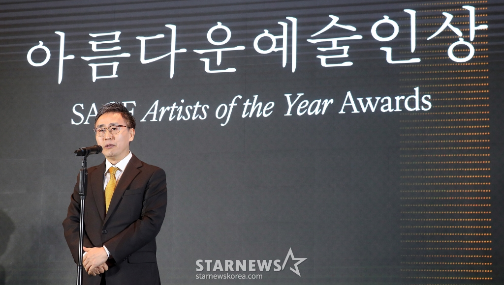김덕영 감독이 24일 오후 서울 강동구 고덕동 스테이지28에서 열린 '제14회 아름다운예술인상'에서 독립영화예술인을 수상한 소감을 말하고 있다.