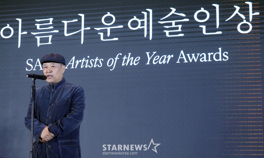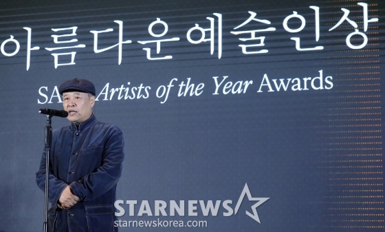 손진책 연출가가 24일 오후 서울 강동구 고덕동 스테이지28에서 열린 '제14회 아름다운예술인상'에서 연극예술인상을 수상한 뒤 소감을 말하고 있다.