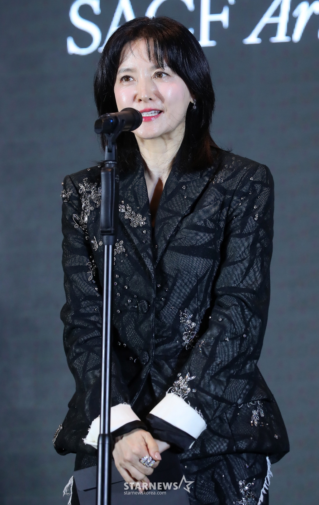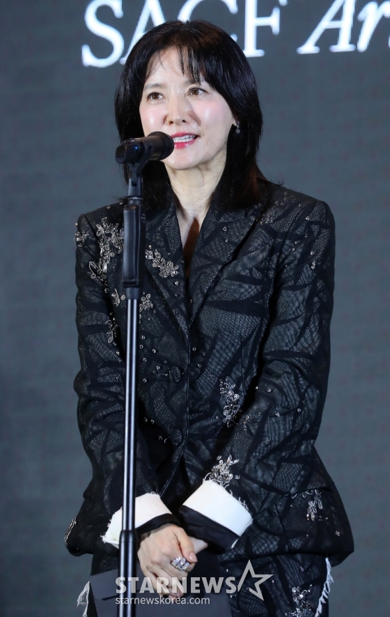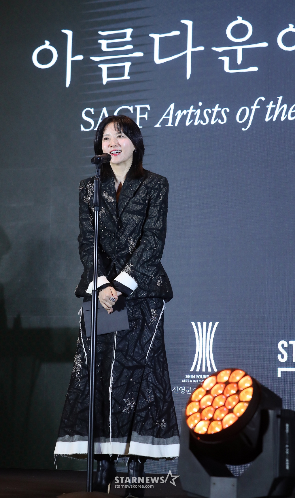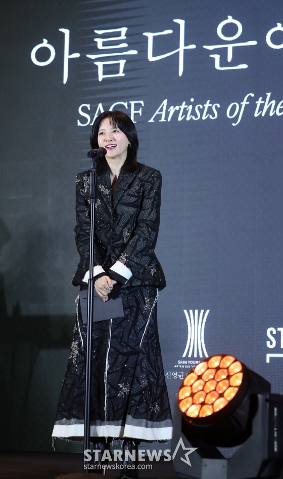 배우 이영애가 24일 오후 서울 강동구 고덕동 스테이지28에서 열린 '제14회 아름다운예술인상'에서 영화예술인상 수상자를 발표하고 있다.