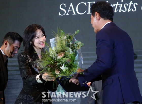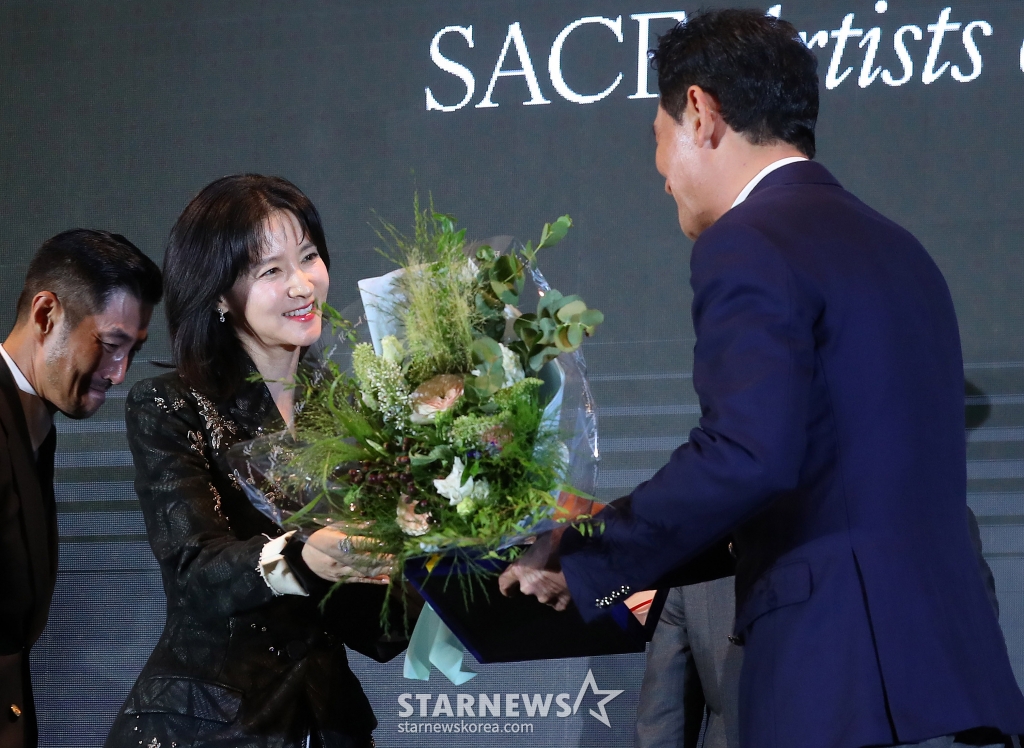 배우 황정민이 24일 오후 서울 강동구 고덕동 스테이지28에서 열린 '제14회 아름다운예술인상'에서 영화예술인상을 수상한 뒤 이영애에게 꽃다발을 받고 있다.