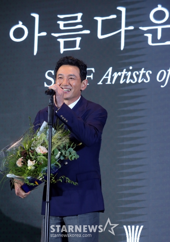 배우 황정민이 24일 오후 서울 강동구 고덕동 스테이지28에서 열린 '제14회 아름다운예술인상'에서 영화예술인상을 수상한 뒤 소감을 말하고 있다.