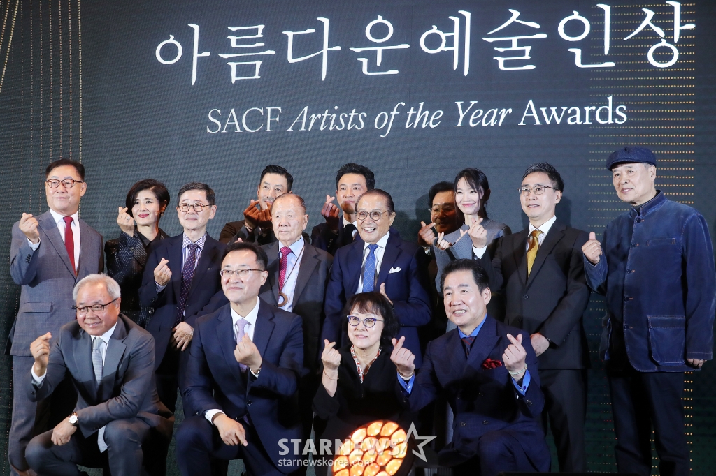 24일 오후 서울 강동구 고덕동 스테이지28에서 열린 '제14회 아름다운예술인상'에서 수상자 및 내빈들이 기념촬영을 하고 있다.